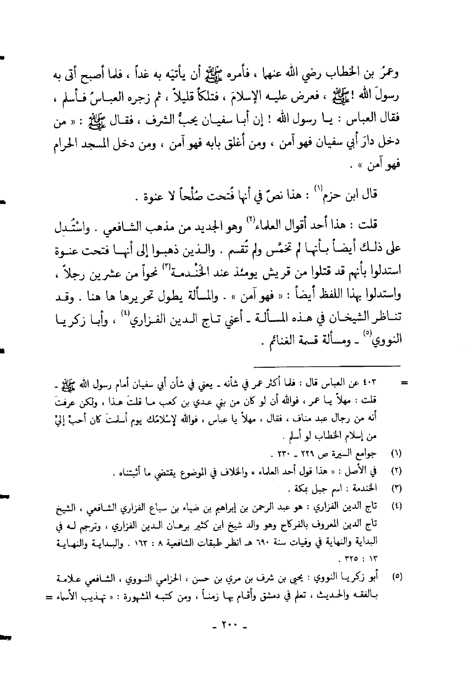 وعمر بن الخطاب رضي الله عنهما، فأمره صلى الله عليه وسلم أن يأتيه به غداً، فلما أصبح أتى به رسول الله صلى الله عليه وسلم، فعرض عليه الإسلام فتلكأ قليلاً، ثم زجره العباس فأسلم، فقال العباس: يا رسول الله! إن أبا سفيان يحب الشرف، فقال صلى الله عليه وسلم «من دخل دار أبي سفيان فهو آمن، ومن أغلق بابه فهو آمن، ومن دخل المسجد الحرام فهو آمن» .