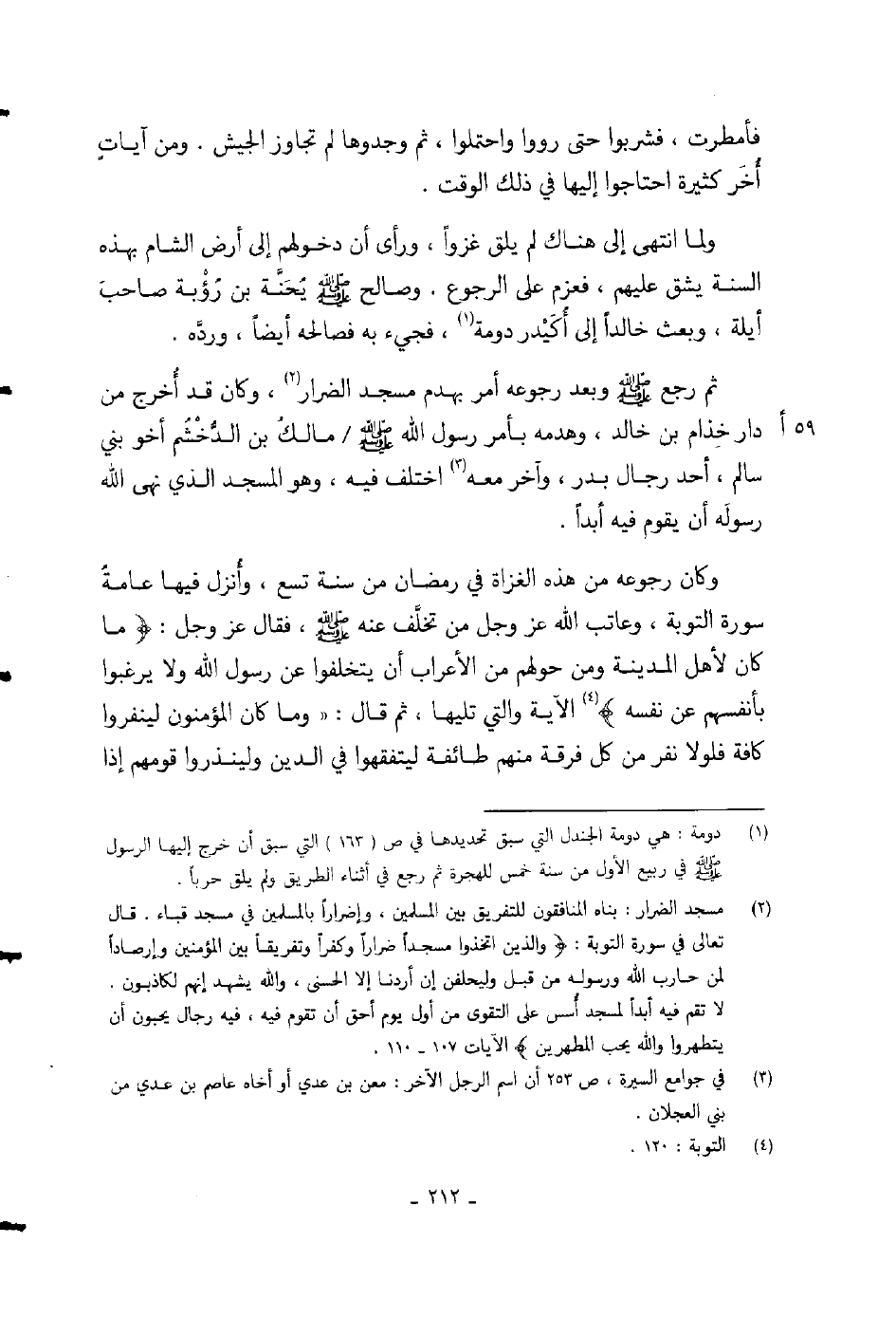 وصالح صلى الله عليه وسلم يحنة بن رؤبة صاحب أيلة، وبعث خالداً إلى أكيدر دومة، فجيء به فصالحه أيضاً، ورده، ثم رجع صلى الله عليه وسلم وبعد رجوعه أمر بهدم مسجد الضرار، وكان قد أخرج من دار خزام بن خالد، وهدمه بأمر رسول الله صلى الله عليه وسلم مالك بن الدخشم أخو بني سالم، أحد رجال بدر، وآخر معه اختلف فيه، وهو المسجد الذي نهى الله رسوله أن يقوم فيه أبداً.