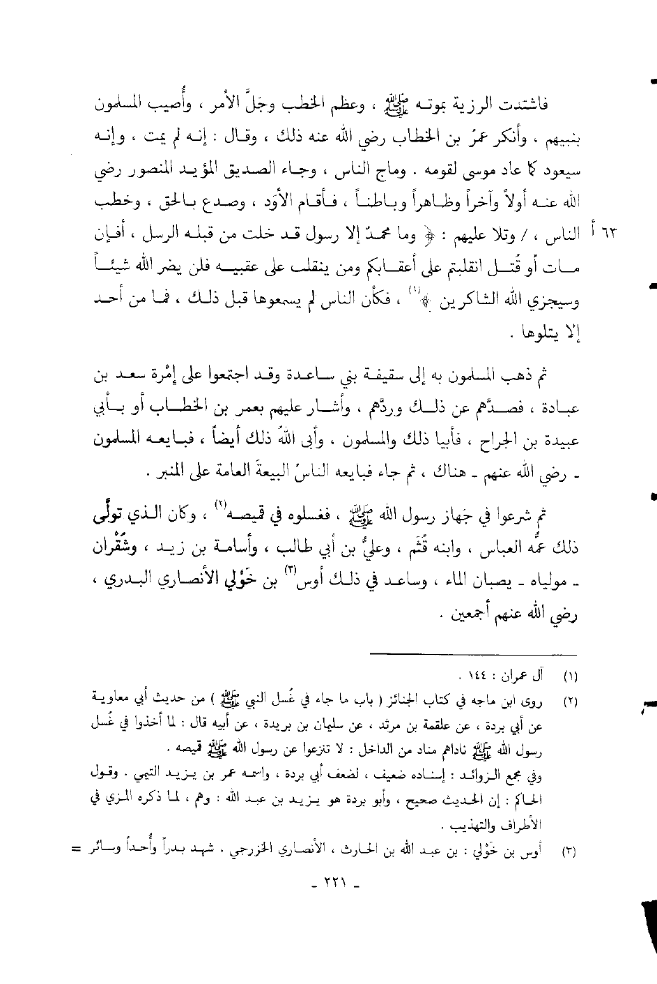 فاشتدت الرزية بموته صلى الله عليه وسلم، وعظم الخطب وجل الأمر، وأصيب المسلمون بنبيهم، وأنكر عمر بن الخطاب رضي الله عنه ذلك، وقال: إنه لم يمت، وإنه سيعود كما عاد موسى لقومه.