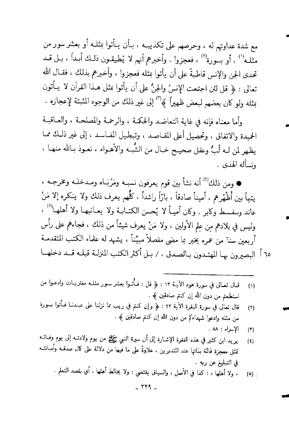 وأخبرهم أنهم لا يطيقون ذلك أبداً، بل قد تحدى الجن والإنس قاطبة على أن يأتوا بمثله فعجزوا، وأخبرهم بذلك، فقال الله تعالى: {قل لئن اجتمعت الإنس والجن على أن يأتوا بمثل هذا القرآن لا يأتون بمثله ولو كان بعضهم لبعض ظهيرا} إلى غير ذلك من الوجوه المثبتة لإعجازه.
