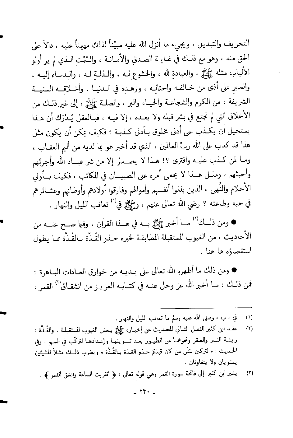 ومن ذلك ما أخبر صلى الله عليه وسلم به في هذا القرآن، وفيما صح عنه من الأحاديث، من الغيوب المستقبلة المطابقة لخبره حذو القذة بالقذة مما يطول استقصاؤه ها هنا.