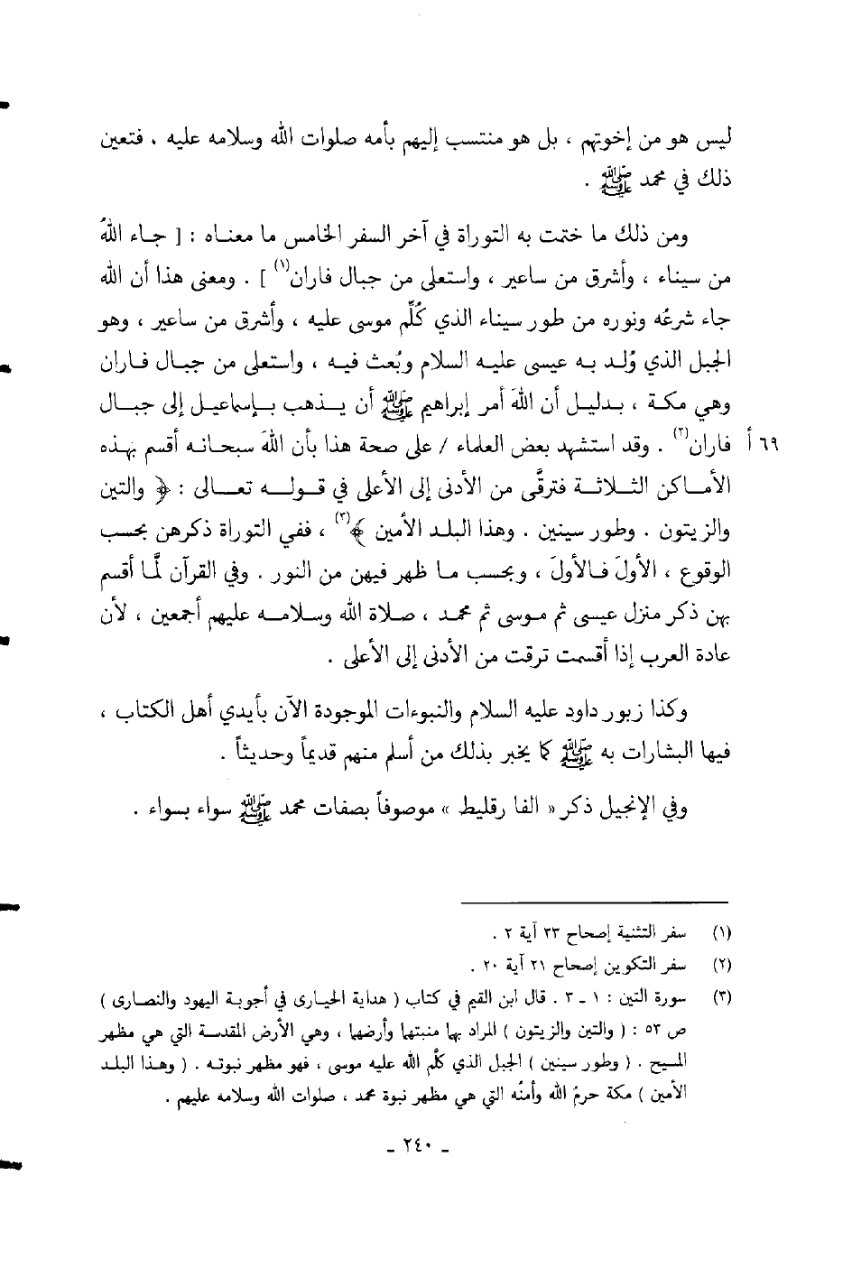 ومن ذلك ما ختمت به التوراة في آخر السفر الخامس ما معناه: [جاء الله من سيناء، وأشرق من ساعير، واستعلى من جبال فاران] .