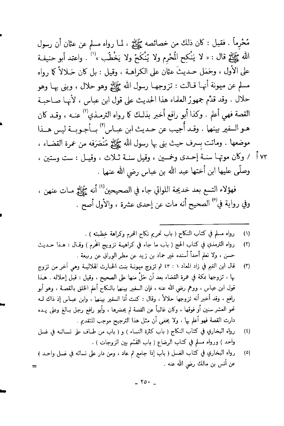 فقيل: كان ذلك من خصائصه صلى الله عليه وسلم لما رواه مسلم «عن عثمان أن رسول الله صلى الله عليه وسلم قال: لا ينكح المحرم ولا ينكح ولا يخطب» واعتمد أبو حنيفة على الأول، وحمل حديث عثمان على الكراهة، وقيل: بل كان حلالاً كما رواه مسلم عن ميمونة أنها قالت: تزوجها رسول الله صلى الله عليه وسلم وهو حلال، وبنى بها وهو حلال.