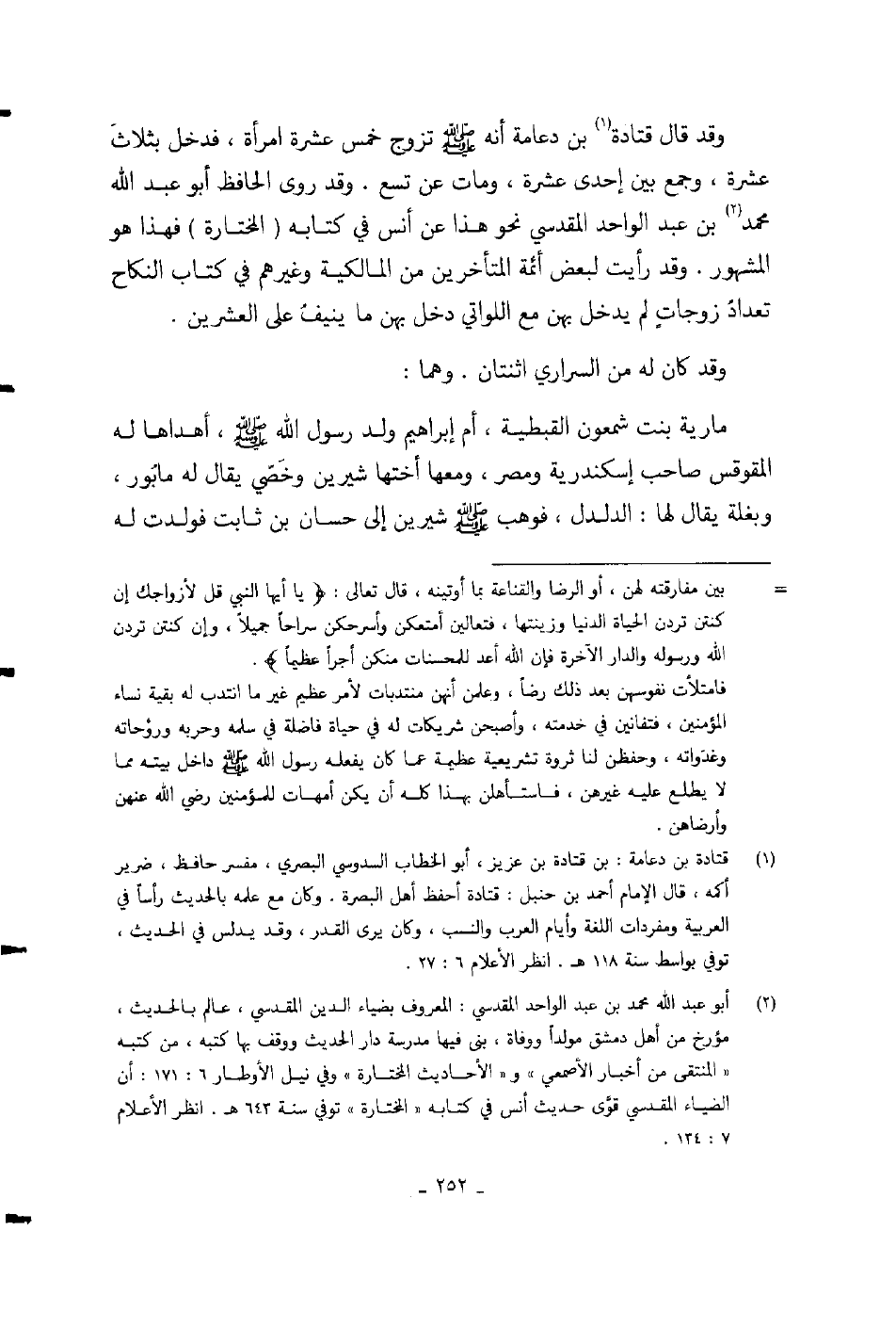 وقد قال قتادة بن دعامة أنه صلى الله عليه وسلم تزوج خمس عشرة امرأة، فدخل بثلاث عشرة، وجمع بين إحدى عشرة، ومات عن تسع.