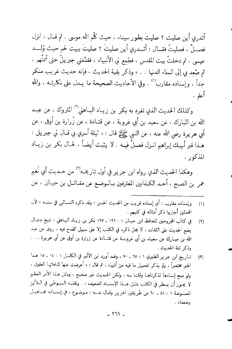 وكذلك الحديث الذي تفرد به بكر الله زياد الباهلي المتروك، «عن عبد الله بن المبارك، عن سعيد بن أبي عروبة، عن قتادة، عن زرارة بن أوفى، عن أبي هريرة رضي الله عنه، عن النبي صلى الله عليه وسلم قال: ليلة أسري بي قال لي جبريل: هذا قبر أبيك إبراهيم انزل فصل فيه» لا يثبت أيضاً، لحال بكر بن زياد المذكور.