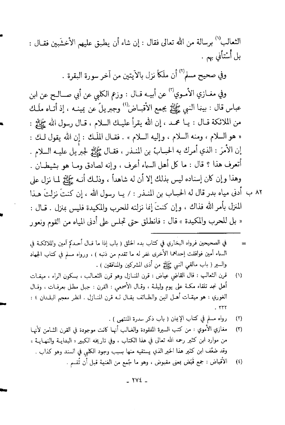 وفي مغازي الأموي عن أبيه قال: وزعم الكلبي «عن أبي صالح عن ابن عباس قال: بينما النبي صلى الله عليه وسلم يجمع الأقباض وجبريل عن يمينه، إذ أتاه ملك من الملائكة قال: يا محمد، إن الله يقرأ عليك السلام، قال رسول الله صلى الله عليه وسلم: هو السلام، ومنه السلام، وإليه السلام فقال الملك: إن الله يقول لك: إن الأمر: الذي أمرك به الحباب بن المنذر، فقال صلى الله عليه وسلم لجبريل عليه السلام أتعرف هذا؟ قال: ماكل أهل السماء أعرف، وإنه لصادق وما هو بشيطان» .
