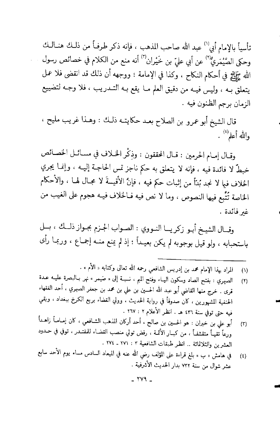 تأسياً بالإمام أبي عبد الله صاحب المذهب، فإنه ذكر طرفاً من ذلك هنالك وحكى الصيمري عن أبي علي بن خيران أنه منع من الكلام في خصائص رسول الله صلى الله عليه وسلم في أحكام النكاح، وكذا في الإمامة، ووجهه أن ذلك قد انقضى فلا عمل يتعلق به، وليس فيه من دقيق العلم ما يقع به التدريب، فلا وجه لتضييع الزمان برجم الظنون فيه.