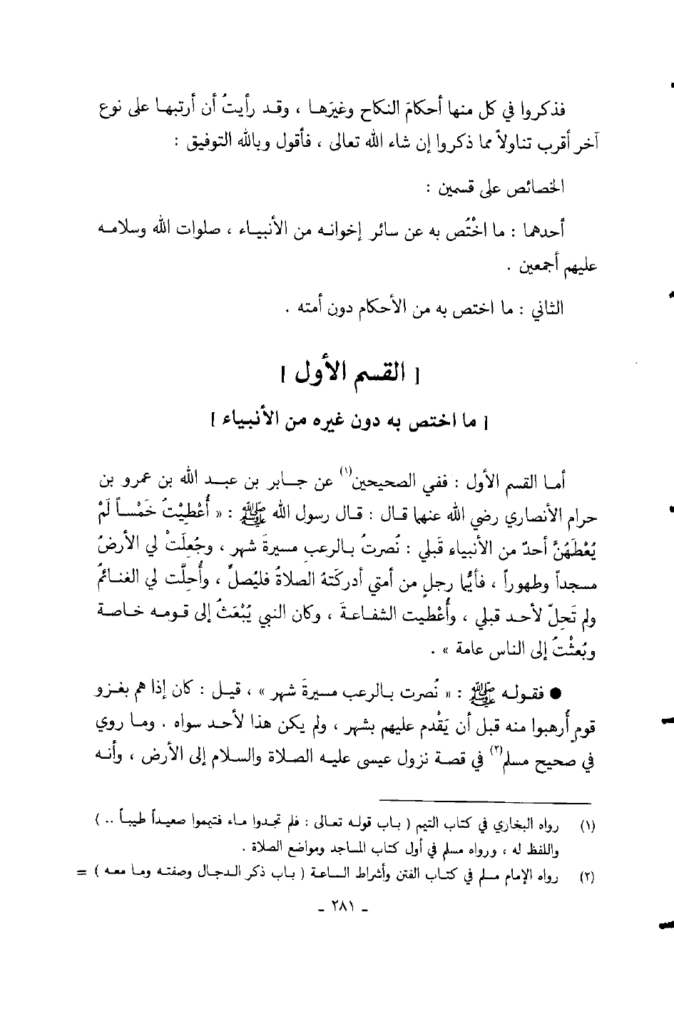 أما القسم الأول: ففي الصحيحين «عن جابر بن عبد الله بن عمرو بن حرام الأنصاري رضي الله عنهم قال: قال رسول الله صلى الله عليه وسلم: أعطيت خمساً لم يعطهن أحد من الأنبياء قبلي: نصرت بالرعب مسيرة شهر، وجعلت لي الأرض مسجداً وطهوراً، فأيما رجل من أمتي أدركته الصلاة فليصل، وأحلت لي الغنائم ولم تحل لأحد قبلي، وأعطيت الشفاعة، وكان النبي يبعث إلى قومه خاصة وبعثت إلى الناس عامة» .