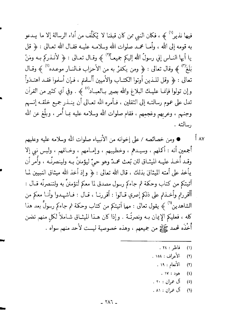 فيها نذير} ، فكان النبي ممن كان قبلنا لا يكلف من أداء الرسالة إلا ما يدعو به قومه إلى الله، وأما محمد صلوات الله وسلامه عليه فقال الله تعالى: {قل يا أيها الناس إني رسول الله إليكم جميعا} وقال تعالى: {لأنذركم به ومن بلغ} وقال تعالى: {ومن يكفر به من الأحزاب فالنار موعده} وقال تعالى: {وقل للذين أوتوا الكتاب والأميين أأسلمتم فإن أسلموا فقد اهتدوا وإن تولوا فإنما عليك البلاغ والله بصير بالعباد} .