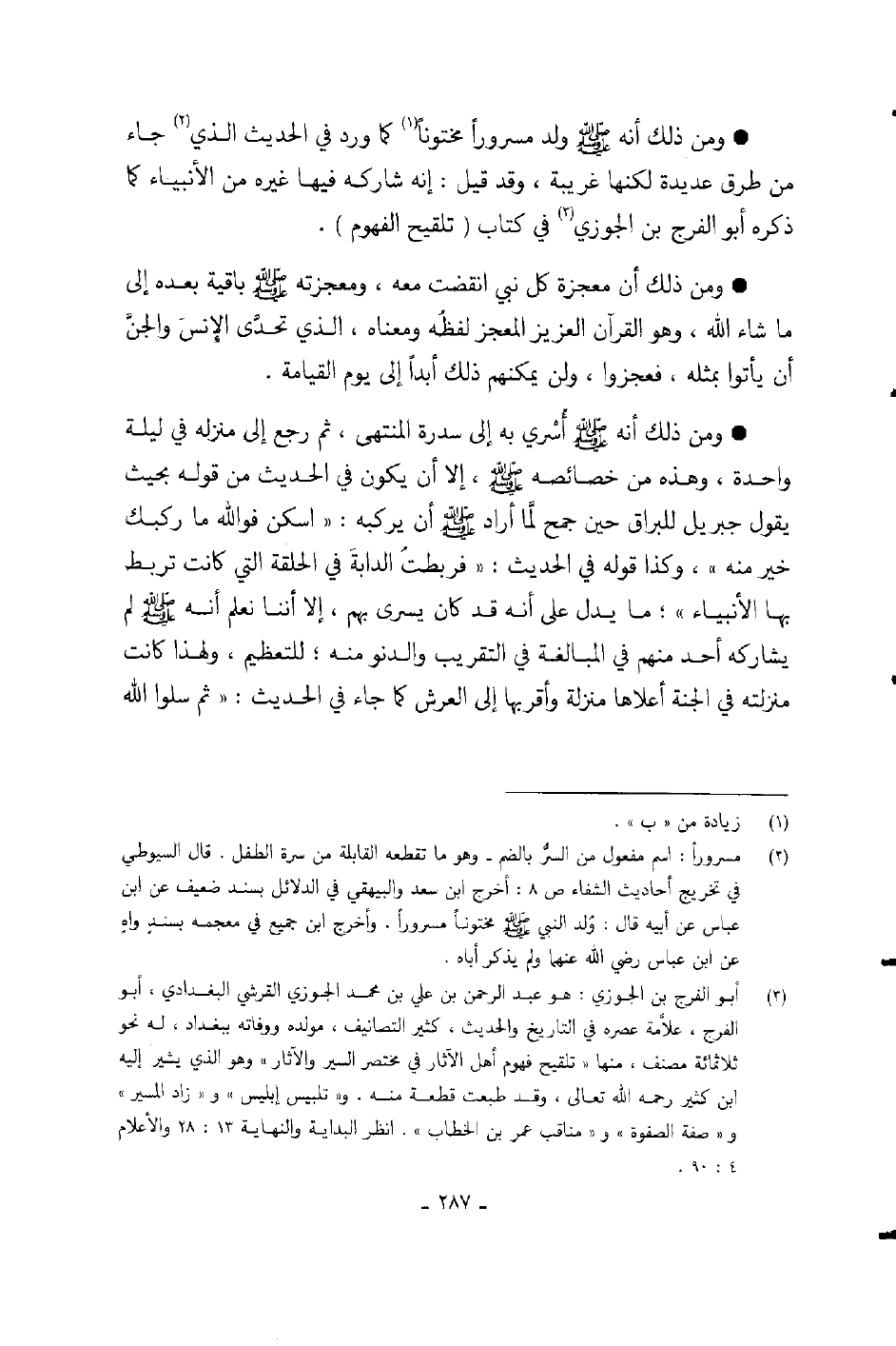 ومن ذلك أنه صلى الله عليه وسلم ولد مسروراً مختوناً كما وردفي الحديث الذي جاء من طرق عديدة لكنها غريبة وقد قيل إنه شاركه فيها غيره من الأنبياء كما ذكره أبو الفرج الجوزي في كتاب تلقيح الفهوم.