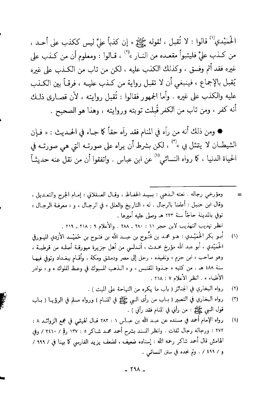 الحميدي قالوا: لا تقبل، لقوله صلى الله عليه وسلم «إن كذباً علي ليس ككذب على أحد من كذب علي فليتبوأ مقعده من النار» ، قالوا: ومعلوم أن من كذب على غيره فقد أثم وفسق، وكذلك الكذب عليه، لكن من تاب من الكذب على غيره يقبل بالإجماع، فينبغي أن لا تقبل رواية من كذب عليه، فرقاً بين الكذب عليه والكذب على غيره.