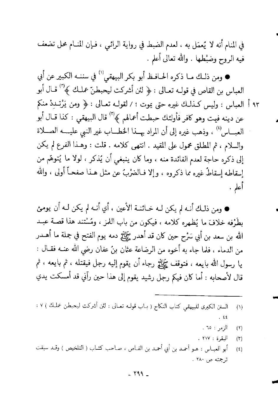 ومن ذلك ما ذكره الحافظ أبو بكر البيهقي في سننه الكبير عن أبي العباس بن القاص في قوله تعالى: {لئن أشركت ليحبطن عملك} قال أبو العباس: وليس كذلك غيره حتى يموت، لقوله تعالى {ومن يرتدد منكم عن دينه فيمت وهو كافر فأولئك حبطت أعمالهم} قال البيهقي: كذا قال أبو العباس، وذهب غيره إلى أن المراد بهذا الخطاب غير النبي عليه الصلاة والسلام، ثم المطلق محمول على المقيد.