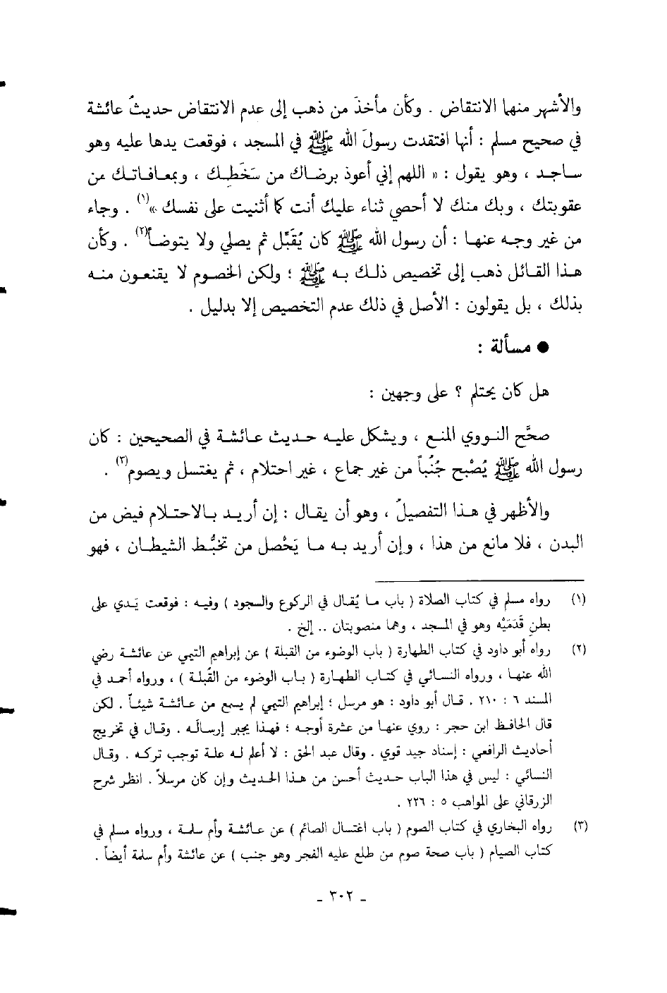 وكأن مأخذ من ذهب إلى عدم الانتقاض حديث عائشة في صحيح مسلم: أنها افتقدت رسول الله صلى الله عليه وسلم في المسجد، فوقعت يدها عليه وهو ساجد، وهو يقول: «اللهم إني أعوذ برضاك من سخطك، وبمعافاتك من عقوبتك، وبك منك لا أحصي ثناء عليك أنت كماأثنيت على نفسك» وجاء من غير وجه عنها: أن رسول الله صلى الله عليه وسلم كان يقبل ثم يصلي ولا يتوضأو كان هذا القائل ذهب إلى تخصيص ذلك به صلى الله عليه وسلم، ولكن الخصوم لا يقنعون منه بذلك، بل يقولون: الأصل في ذلك عدم التخصيص إلا بدليل.