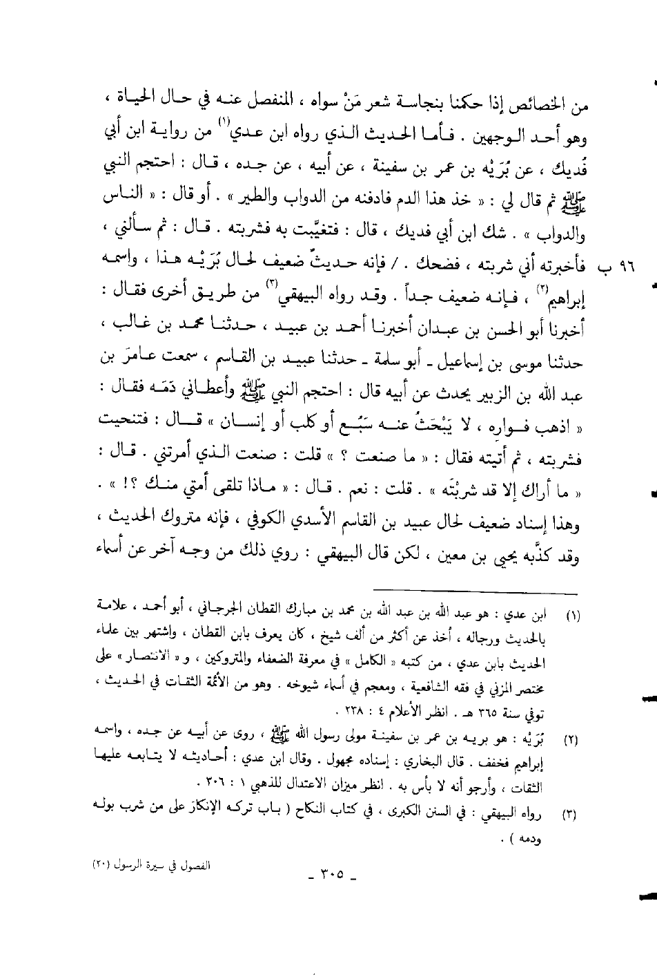 فأما الحديث الذي رواه ابن عدي من رواية ابن أبي فديك، «عن بريه بن عمر بن سفينة، عن أبيه عن جده، قال: احتجم النبي صلى الله عليه وسلم ثم قال لي: خذ هذا الدم فادفنه من الدواب والطير.