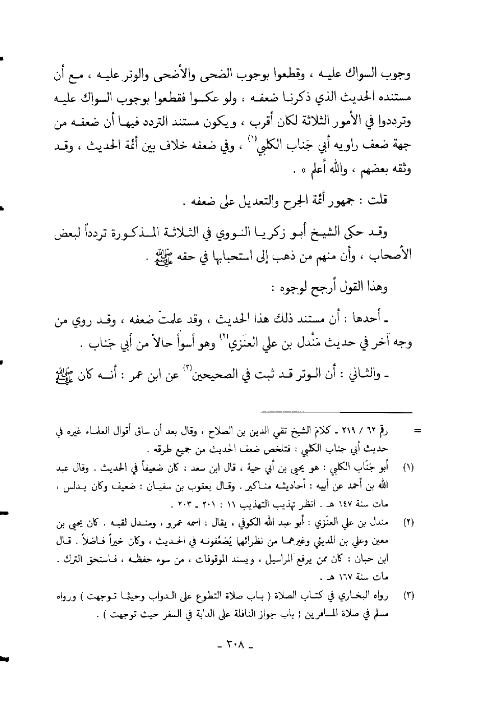 وجوب السواك عليه، وقطعوا بوجوب الضحى والأضحى والوتر عليه، مع أن مستنده الحديث الذي ذكرنا ضعفه، ولو عكسوا فقطعوا بوجوب السواك عليه وترددوا في الأمور الثلاثة لكان أقرب، ويكون مستند التردد فيها أن ضعفه من جهة ضعف راويه أبي جناب الكلبي، وفي ضعفه خلاف بين أئمة الحديث، وقد وثقه بعضهم، والله أعلم] .