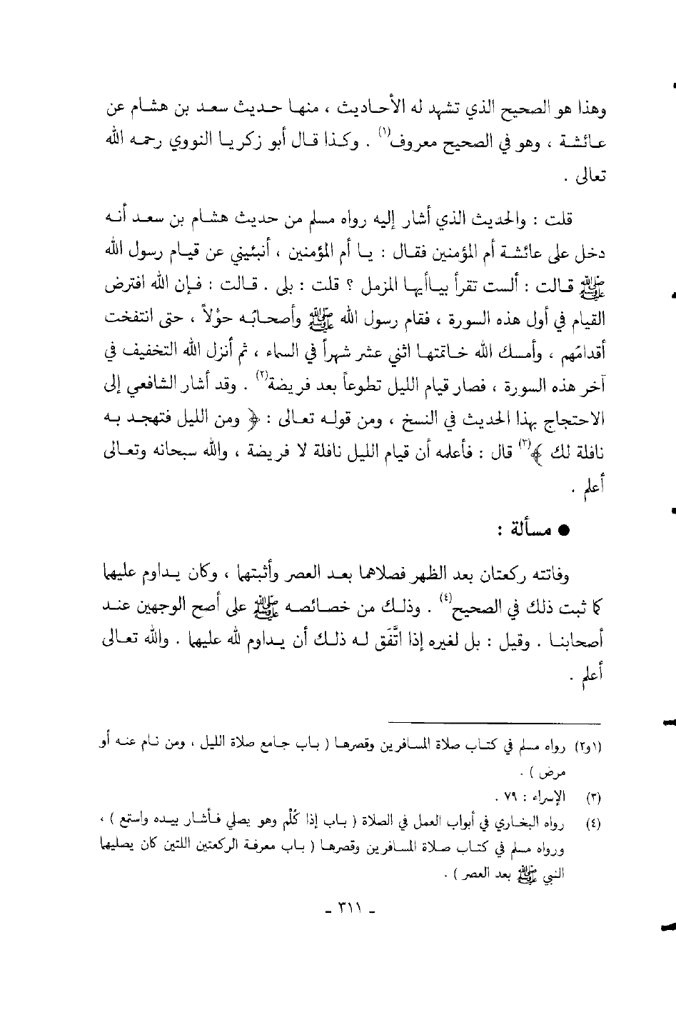 قلت: والحديث الذي أشار إليه رواه مسلم من حديث هشام بن سعد أنه دخل على عائشة أم المؤمنين فقال: يا أم المؤمنين، أنبئيني عن قيام رسول الله صلى الله عليه وسلم قالت: ألست تقرأ بيا أيها المزمل؟ قلت: بلى.