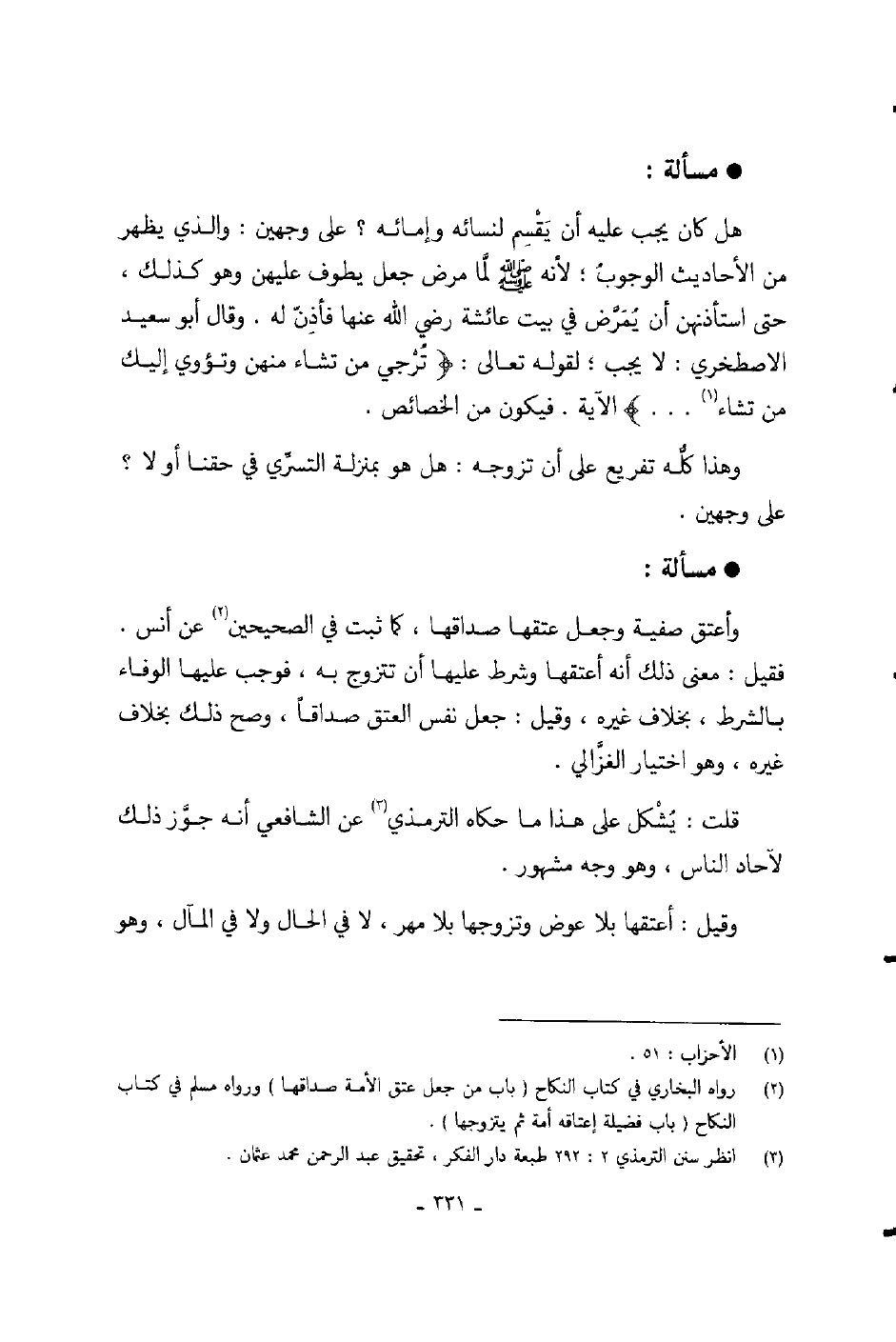 هل كان يجب عليه أن يقسم لنسائه وإمائه؟ على وجهين: والذي يظهر من الأحاديث الوجوب، لأنه صلى الله عليه وسلم لما مرض جعل يطوف عليهن وهو كذلك، حتى استأذنهن أن يمرض في بيت عائشة رضي الله عنها فأذن له.