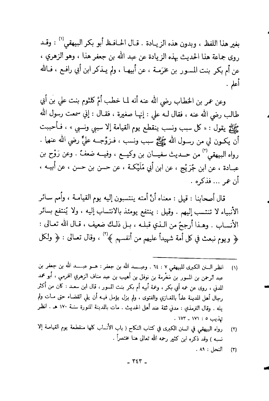 «وعن عمر بن الخطاب رضي الله عنه أنه لما خطب أم كلثوم بنت علي بن أبي طالب رضي الله عنه، فقال له علي: إنها صغيرة، فقال: إني سمعت رسول الله صلى الله عليه وسلم يقول: كل سبب ونسب ينقطع يوم القيامة إلا سببي ونسبي» ، فأحببت أن يكون لي من رسول الله صلى الله عليه وسلم سبب ونسب، فزوجه علي رضي الله عنهما.