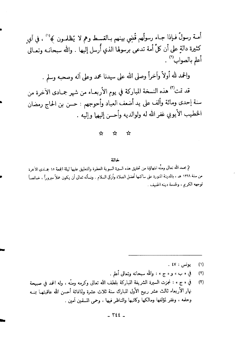 قد تمت هذه النسخة المباركة في يوم الأربعاء من شهر جمادى الآخرة من سنة إحدى ومائة وألف على يد أضعف العباد وأحوجهم: حسن بن الحاج رمضان الخطيب الأيوبي غفر الله له ولوالديه وأحسن إليهما وإليه.