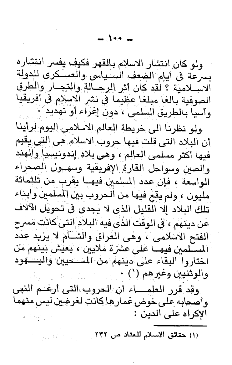 ولو نظرنا إلى خريطة العالم الإسلامى اليوم لرأينا أن البلاد التى قلت فيها حروب الإسلام هى التى يقيم فيها أكثر مسلمى العالم، وهى بلاد إندونيسيا والهند والصين وسواحل. القارة الإفريقية وسهول الصحراء الواسعة، فإن عدد المسلمين، فيها يقرب من ثلثمائة مليون، ولم يقع فيها من الحروب بين المسلمين وأبناء تلك البلاد إلا القليل الذى لا يجدى فى تحويل الآلاف عن دينهم، فى الوقت الذى فيه البلاد التى كانت مسرح الفتح الإسلامى، وهى العراق والشام لا يزيد عدد المسلمين فيها على عشرة ملايين، يعيش بينهم من اختاروا البقاء على دينهم من المسيحيين واليهود والوثنيين وغيرهم (¬1).