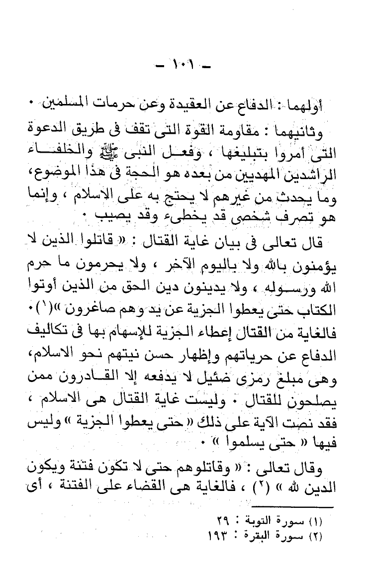 قال تعالى فى بيان غاية القتال: {قَاتِلُوا الَّذِينَ لَا يُؤْمِنُونَ بِاللَّهِ وَلَا بِالْيَوْمِ الْآخِرِ وَلَا يُحَرِّمُونَ مَا حَرَّمَ اللَّهُ وَرَسُولُهُ وَلَا يَدِينُونَ دِينَ الْحَقِّ مِنَ الَّذِينَ أُوتُوا الْكِتَابَ حَتَّى يُعْطُوا الْجِزْيَةَ عَنْ يَدٍ وَهُمْ صَاغِرُونَ (29)} (¬1). فالغاية من القتال إعطاء الجِزيَةَ للإسهام بها فى تكاليف الدفاع عن حرياتهم وإظهار حسن نيتهم نحو الإسلام، وهى مبلغ رمزى ضئيل لا يدفعه إلا القادرون ممن يصلحون للقتال. وليست غاية القتال هى الإسلام، فقد نصت الآية علي ذلك {حَتَّى يُعْطُوا الْجِزْيَةَ} وليس فيها "حتَّى يسلموا".