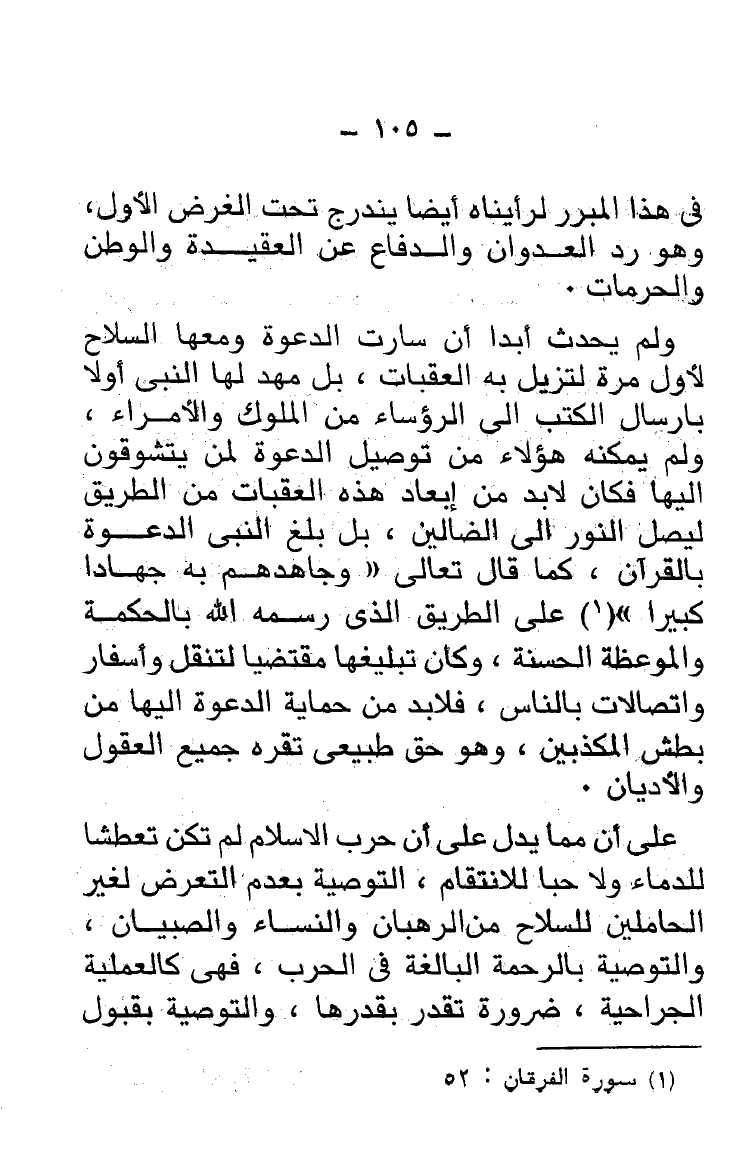 ولم يحدث أبدًا أن سارت الدعوة ومعها السلاح لأول مرة لتزيل به العقبات، بل مهد لها النبيّ أولا بإرسال الكتب إلى الرؤساء من الملوك والأمراء، ولم يمكنه هؤلاء من توصيل الدعوة لمن يتشوقون إليها فكان لابد من إبعاد هذه العقبات من الطَّرِيقِ ليصل النور إلى الضالين، بل بلغ النبيّ الدعوة بالقرآن، كما قال تعالى "وجاهدهم به جهادًا كبيرًا"، (¬1) على الطَّرِيقِ الذى رسمه الله بالحكمة والموعظة الحسنة، وكان تبليغها مقتضيا لتنقل وأسفار واتصالات بالناس، فلابد من حماية الدعوة إليها من بطش المكذبين، وهو حق طبيعى تقره جميع العقول والأديان.