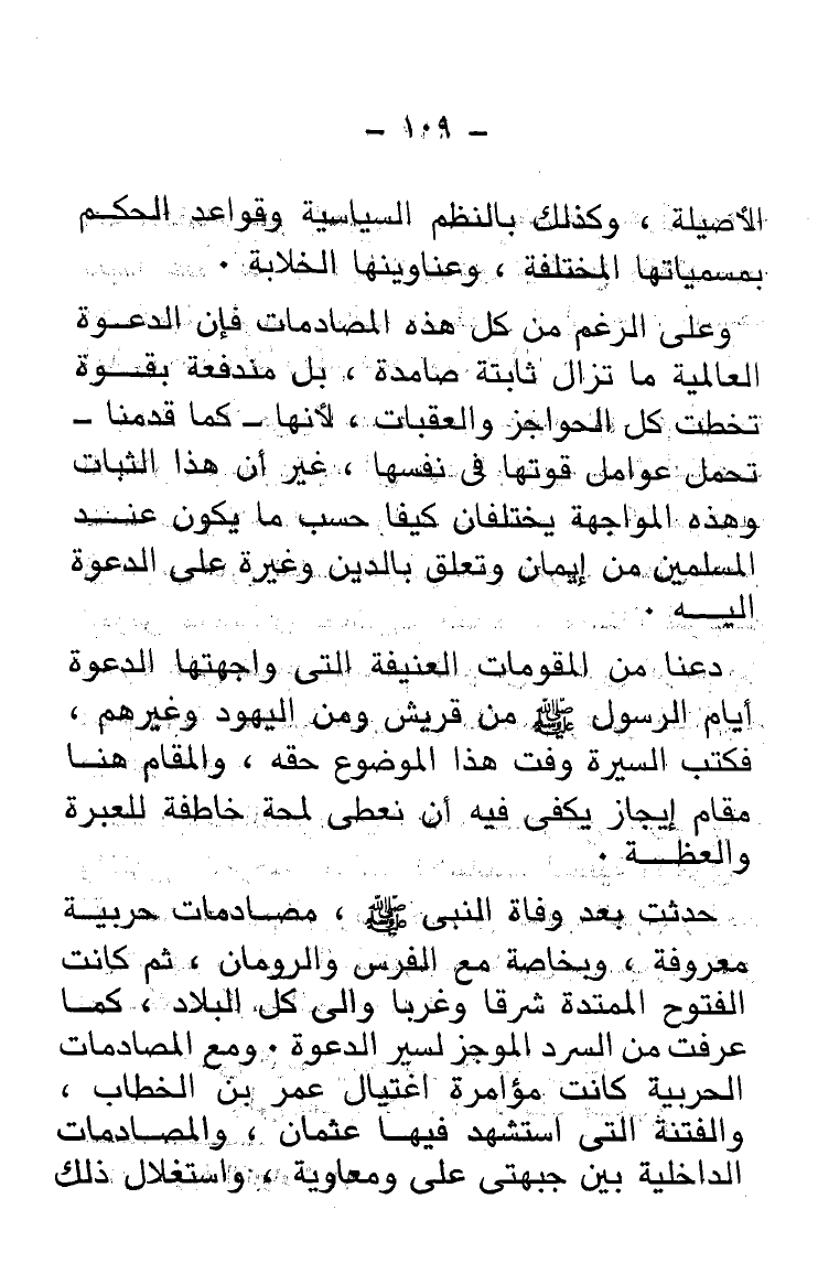 وعلى الرغم من كل هذه المصادمات فإن الدعوة العالمية ما تزال ثابتة صامدة، بل مندفعة بقوة تخطت كل الحواجز والعقبات، لأنها -كما قدمنا- تحمل عوامل قوتها فى نفسها، غير إن هذا الإثبات وهذه المواجهة يختلفان كيفا حسب ما يكون عند المسلمين من إيمان وتعلق بالدين وغيرة على الدعوة إليه.