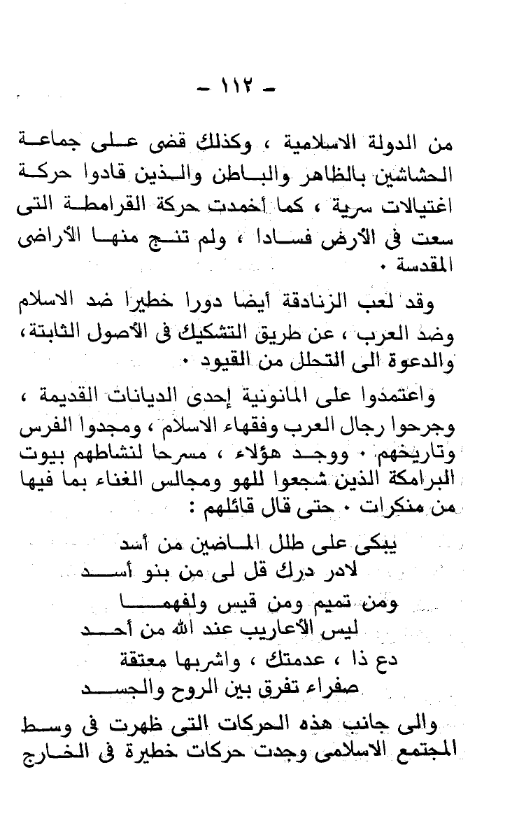 وقد لعب الزنادقة أيضًا دورًا خطيرًا ضد الإسلام وضد العرب، عن طريق التشكيك فى الأصول الثابتة والدعوة إلى التحلل من القيود.