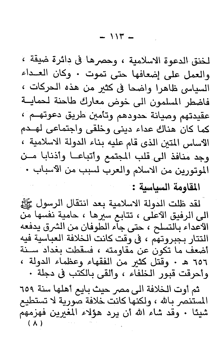 لقد ظلت الدولة الإسلامية بعد انتقال الرسول - صلى الله عليه وسلم - إلى الرفيق الأعلى، تتابع سيرها، حامية نفسها من الأعداء بالتسلح، حتَّى جاء الطوفان من الشرق يدفعه التتار بجبروتهم، فى وقت كانت الخلافة العباسية فيه أضعف ما تكون عن مقاومته، فسقطت بغداد سنة 656 هـ. وقتل كثير من الفقهاء وعظماء الدولة، وأحرقت قبور الخلفاء، وألقى بالكتب فى دجلة.
