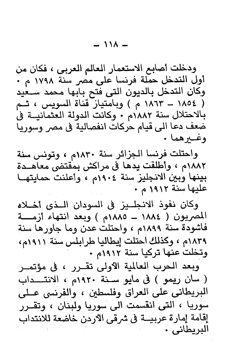 ودخلت أصابع الاستعمار العالم العربى، فكان من أول التدخل حملة فرنسا على مصر سنة 1798 م. وكان التدخل بالديون التى فتح بابها محمد سعيد (1854 - 1863 م) وبامتياز قناة السويس، ثم بالاحتلال سنة 1882 م. وكانت الدولة العثمانية فى ضعف دعا إلى قيام حركات انفصالية فى مصر وسوريا وغيرهما.