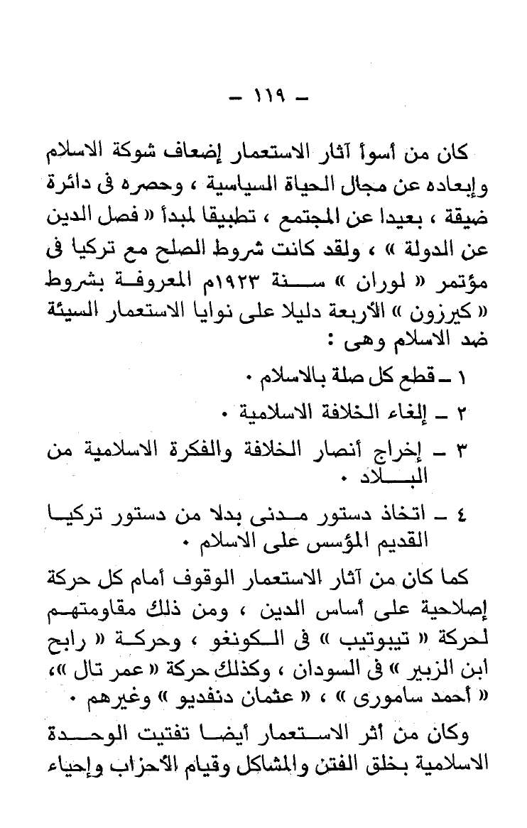 كان من أسوأ آثار الاستعمار إضعاف شوكة الإسلام وإبعاده عن مجال الحيال السياسية، وحصره فى دائرة ضيقة، بعيدًا عن المجتمع، تطبيقا لمبدأ "فصل الدين عن الدولة"، ولقد كانت شروط الصلح مع تركيا فى مؤتمر "لوران"، سنة 1923 م المعروفة بشروط "كيرزون" الأربعة دليلا على نوايا الاستعمار السيئة ضد الإسلام وهى: