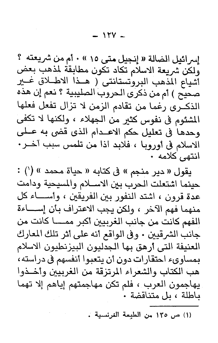إسرائيل الضالة "إنجيل متى 15". أم من شريعته؟ ولكن شريعة الإسلام تكاد تكون مطابقة لمذهب بعض أشياع المذهب البروتستانتى (هذا الإطلاق غير صحيح) أم من ذكرى الحروب الصليبية؟ نعم إن هذه الذكرى رغما من تقادم الزمن لا تزال تفعل فعلها المشئوم فى نفوس كثير من الجهلاء، ولكنها لا تكفى وحدها فى تعليل حكم الإعدام الذى قضى به على الإسلام في أوروبا، فلابد إذًا من تلمس سبب آخر. انتهى كلامه.