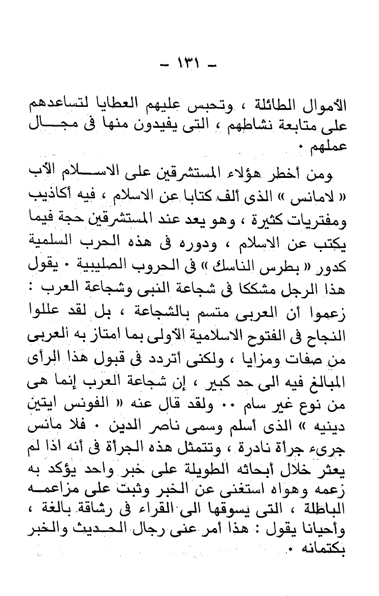 ومن أخطر هؤلاء المستشرقين على الإسلام الأب "لامانس" الذى ألف كتابا عن الإسلام، فيه أكاذيب ومفتريات كثيرة، وهو يعد عند المستشرقين حجة فيما يكتب عن الإسلام، ودوره فى هذه الحرب السلمية كدور "بطرس الناسك" فى الحروب الصليبية. يقول هذا الرجل مشككا فى شجاعة النبيّ وشجاعة العرب: زعموا أن العربى متسم بالشجاعة، بل لقد عللوا النجاح فى الفتوح الإسلامية الأولى بما امتاز به العربى من صفات ومزايا، ولكنى أتردد فى قبول هذا الرأى المبالغ فيه إلى حد كبير، إن شجاعة العرب إنما هى من نوع غير سام. . ولقد قال عنه "الفونس ايتين دينيه" الذى أسلم وسمى ناصر الدين. فلا مانس جرئ جرأة نادرة، وتتمثل هذه الجرأة فى أنَّه إذا لم يعثر خلال أبحاثه الطويلة على خبر واحد يؤكد به زعمه وهواه استغنى عن الخبر وثبت على مزاعمه الباطلة، التى يسوقها إلى القراء فى رشاقة بالغة، وأحيانا يقول: هذا أمر عنى رجال الحديث والخبر بكتمانه.