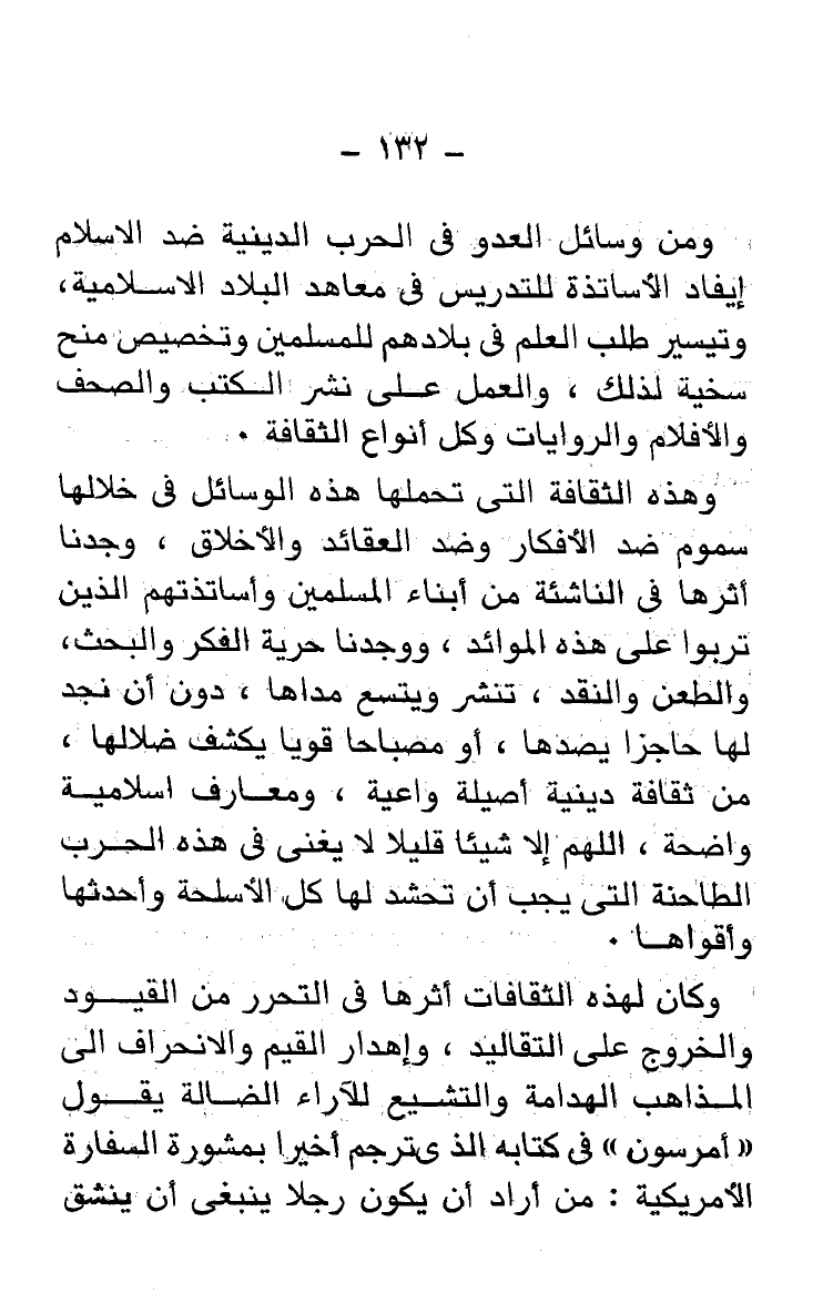 ومن وسائل العدو الحرب الدينية ضد الإسلام إيفاد الأساتذة للتدريس فى معاهد البلاد الإسلامية، وتيسير طلب العلم فى بلادهم للمسلمين وتخصيص منح سخية لذلك، والعمل على نشر الكتب والصحف والأفلام والروايات وكل أنواع الثقافة.