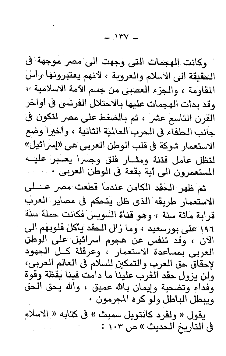 ثم ظهر الحقد الكامن عندما قطعت مصر على الاستعمار طريقه الذى ظل يتحكم في مصاير العرب قرابة مائة سنة، وهو قناة السويس فكانت حملة سنة 1956 على بورسعيد، وما زال الحقد يأكل قلوبهم إلى الآن، وقد تنفس عن هجوم إسرائيل وعلى الوطن العربى بمساعدة الاستعمار، وعرقلة كل الجهود لإحقاق حق العرب والتمكين للسلام فى العالم العربى، ولن يزول حقد الغرب علينا ما دامت فينا يقظة وقوة وفداء وتضحية وإيمان بالله عميق، والله يحق الحق ويبطل الباطل ولو كره المجرمون.