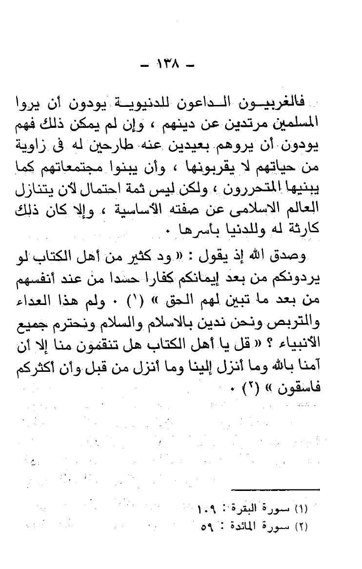 فالغربيون الداعون للدنيوية يودون أن يروا المسلمين مرتدين عن دينهم، وإن لم يمكن ذلك فهم يودون أن يروهم بعيدين عنه طارحين له فى زاوية من حياتهم لا يقربونها، وأن يبنوا مجتمعاتهم كما يبنيها المتحررون، ولكن ليس ثمة احتمال لأن يتنازل العالم الإسلامى عن صفته الأساسية، وإلا كان ذلك كارثة له وللدنيا بأسرها.