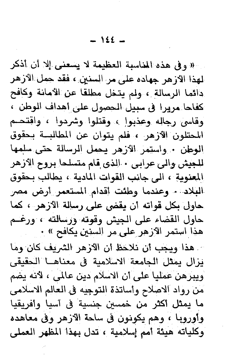 "وفى هذه المناسبة العظيمة لا يسعنى إلَّا أن أذكر لهذا الأزهر جهاده على مر السنين، فقد حمل الأزهر دائما الرسالة، ولم يتخل مطلقًا عن الأمانة وكافح كفاحا مريرا فى سبيل الحصول على أهداف الوطن، وقاسى رجاله وعذبوا، وقتلوا وشردوا، واقتحم المحتلون الأزهر، فلم يتوان عن المطالبة بحقوق الوطن. واستمر الأزهر يحمل الرسالة حتَّى سلمها للجيش وإلى عرابى. الذى قام متسلحا بروح الأزهر المعنوية، إلى جانب القوات المادية، يطالب بحقوق البلاد وعندما وطئت أقدام المستعمر أرض مصر حاول بكل قواته أن يقضى على رسالة الأزهر، كما حاول القضاء على الجيش وقوته، ورسالته، ورغم هذا استمر الأزهر على مر السنين يكافح".
