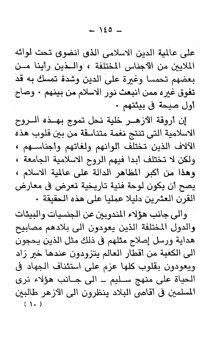 إن أروقة الأزهر خلية نحل تموج بهذه الروح الإسلامية التى تنتج نغمة متناسقة من بين قلوب هذه الآلاف الذين تختلف ألوانهم ولغاتهم وأجناسهم، ولكن لا تختلف أبدا فيهم الروح الإسلامية الجامعة، وهذا من أكبر المظاهر الدالة على عالمية الإسلام، يصح أن يكون لوحة فنية تاريخية تعرض في معارض القرن العشرين دليلا عمليا على هذه الحقيقة.