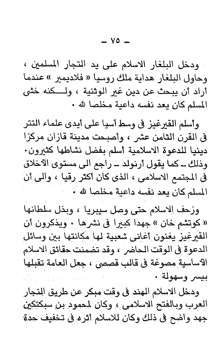 وأسلم القيرغيز فى وسط أسيا على أيدى علماء التتر فى القرن الثامن عشر، وأصبحت مدينة قازان مركزا ديئيا للدعوة الإسلامية أسلم بفضل نشاطها كثيرون. وذلك -كما يقول أرنولد- راجع إلى مستوى الأخلاق فى المجتمع الإسلامى، الذى كان أكثر رقيا، وإلى أن المسلم كان يعد نفسه داعية فخلصا لله.