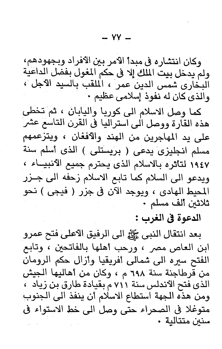 كما وصل الإسلام إلى كوريا واليابان، ثم تخطى هذه القارة ووصل إلى استراليا فى القرن التاسع عشر على يد المهاجرين من الهند والأفغان، ويتزعمهم مسلم انجليزى يدعى (بريستلى) الذى أسلم سنة 1947 لتأثره بالإسلام الذى يحترم جميع الأنبياء، ويدعو إلى السلام كما تابع الإسلام زحفه إلى جزر المحيط الهادى، ويوجد الآن فى جزر (فيجى) نحو ثلاثين ألف مسلم.