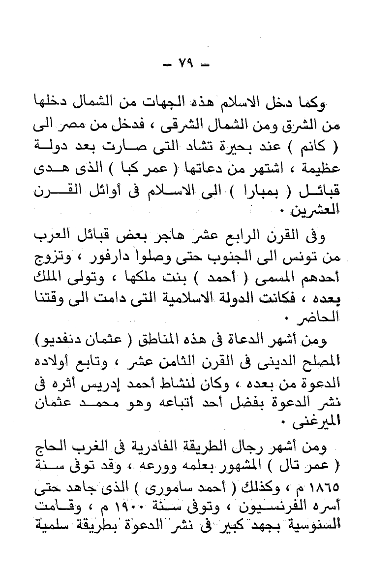 وكما دخل الإسلام هذه الجهات من الشمال دخلها من الشرق ومن الشمال الشرقى، فدخل من مصر إلى (كانم) عند بحيرة تشاد التى صارت بعد دولة عظيمة، اشتهر من دعاتها (عمر كبا) الذى هدى قبائل (بمبارا) إلى الإسلام فى أوائل القرن العشرين.