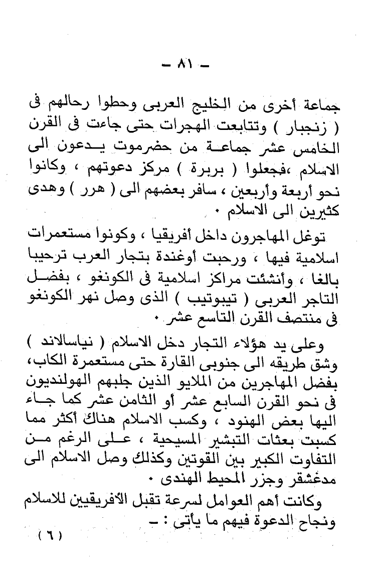 جماعة أخرى من الخليج العربى وحطوا رحالهم فى (زنجبار) وتتابعت الهجرات حتى جاءت فى القرن الخامس عشر جماعة من حضرموت يدعون إلى الإسلام، فجعلوا (بربرة) مركز دعوتهما، وكانوا نحو أربعة وأربعين، سافر بعضهم إلى (هرر) وهدى كثيرين إلى الإسلام.