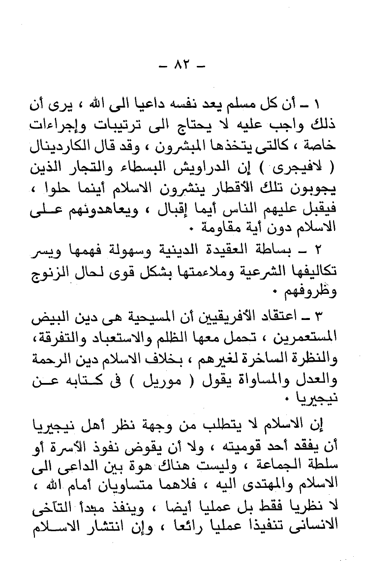 إن الإسلام لا يتطلب من وجهة نظر أهل نيجيريا أن يفقد أحد قوميته، ولا أن يقوض نفوذ الأسرة أو سلطة الجماعة، وليست هناك هوة بين الداعى إلى الإسلام والمهتدى إليه، فلاهما متساويان أمام الله، لا نظريا فقط بل عمليا أيضًا، وينفذ مبدأ التآخى الإنسانى تنفيذا عمليا رائعا، وإن انتشار الإسلام