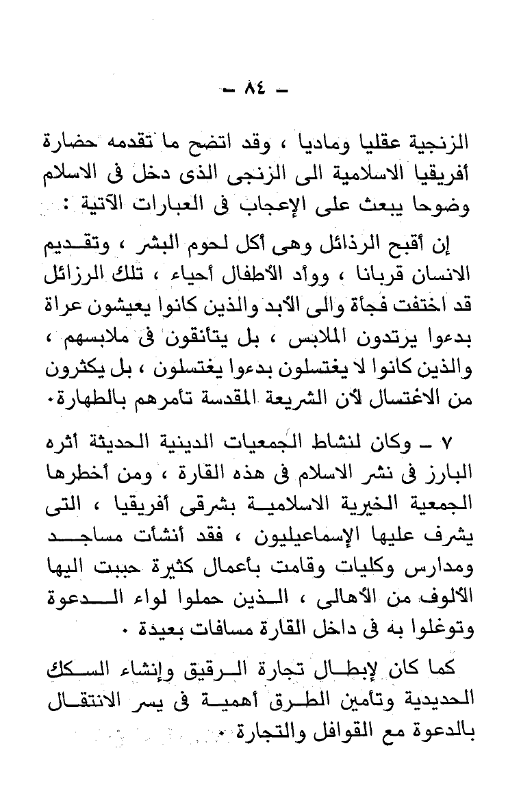 الزنجية عقليا وماديا، وقد اتضح ما "تقدمه حضارة أفريقيا الإسلامية إلى الزنجى الذى دخل فى الإسلام وضوحا يبعث على الإعجاب فى العبارات الآتية: