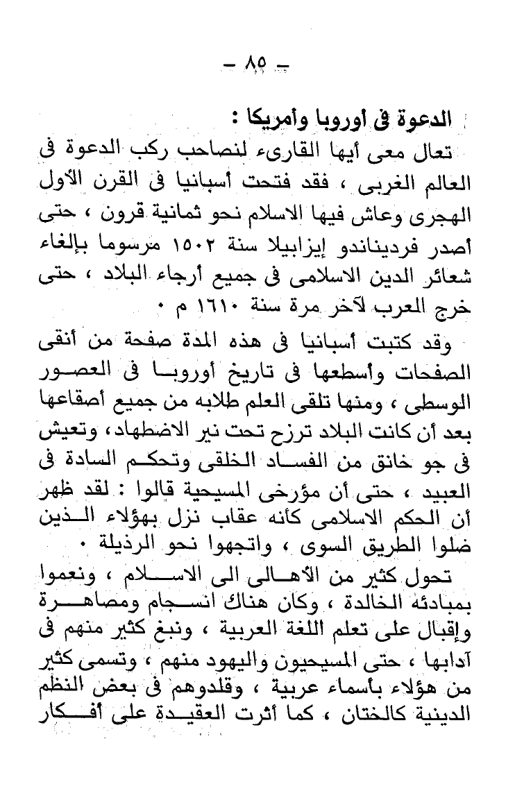 تعال معى أيها القارئ لنصاحب ركب الدعوة فى العالم الغربى، فقد فتحت أسبانيا فى القرن الأول الهجرى وعاش فيها الإسلام نحو ثمانية قرون، حتى أصدر فرديناندو إيزابيلا سنة 1502 مرسوما بإلغاء شعائر الدين الإسلامى فى جميع أرجاء البلاد، حتى خرج العرب لآخر مرة سنة 1610 م.