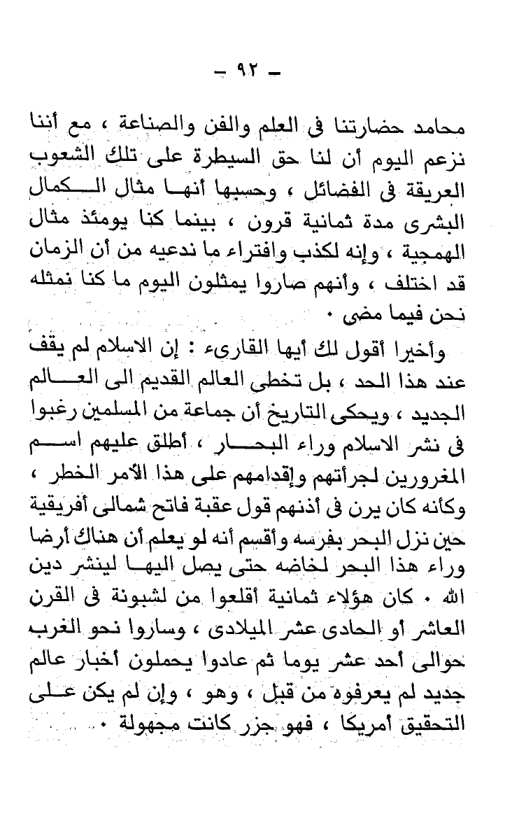 محامد حضارتنا فى العلم والفن والصناعة، مع أننا نزعم اليوم أن لنا حق السيطرة على تلك الشعوب العريقة فى الفضائل، وحسبها أنها مثال الكمال البشرى مدة ثمانية قرون، بينما كنا يومئذ مثال الهمجية، وإنه لكذب وافتراء ما ندعيه من أن الزمان قد اختلف، وأنهم صاروا يمثلون اليوم ما كنا نمثله نحن فيما مضى.