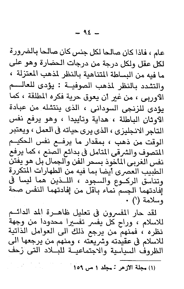 عام، فإذا كان صالحًا لكل جنس كان صالحًا بالضرورة لكل عقل ولكل درجة من درجات الحضارة وهو على ما فيه من البساطة المتناهية بالنظر لمذهب المعتزلة، والتشدد بالنظر لمذهب الصوفية: يؤدى للعالم الأوربى، من غير أن يعوق حرية فكره المطلقة، كما يؤدى للزنجى السودانى، الذى ينتشله من عبادة الأوثان الباطلة، هداية وتأييدا، وهو يرفع نفس التاجر الانجليزى، الذى يرى حياته فى العمل، ويعتبر الوقت من ذهب، بمقدار ما يرفع نفس الحكيم المتصوف والشرقى المتأمل فى بدائع الصنع، كما يرفع نفس الغربى المأخوذ بسحر الفن والجمال بل هو يفتن الطبيب العصرى أيضًا بما فيه من الطهارات المتكررة وتناسق الركوع والسجود، اللذين هما ليسا فى إفادتهما الجسم نماء بأقل من إفادتهما النفس صحة وسلامة (¬1).