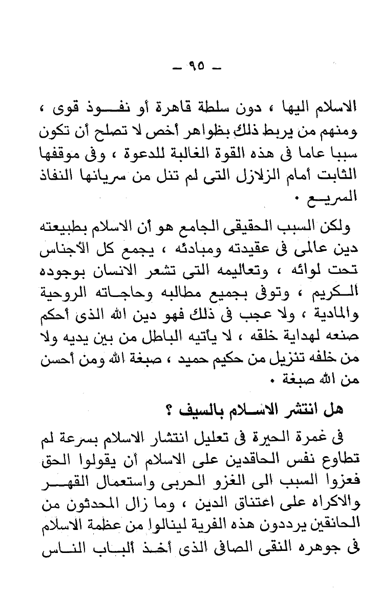 الإسلام إليها، دون سلطة قاهرة أو نفوذ قوى، ومنهم من يربط ذلك بظواهر أخص لا تصلح أن تكون سببا عاما فى هذه القوة الغالبة للدعوة، وفى موقفها الثابت أمام الزلازل التى لم تنل من سريانها النفاذ السريع.