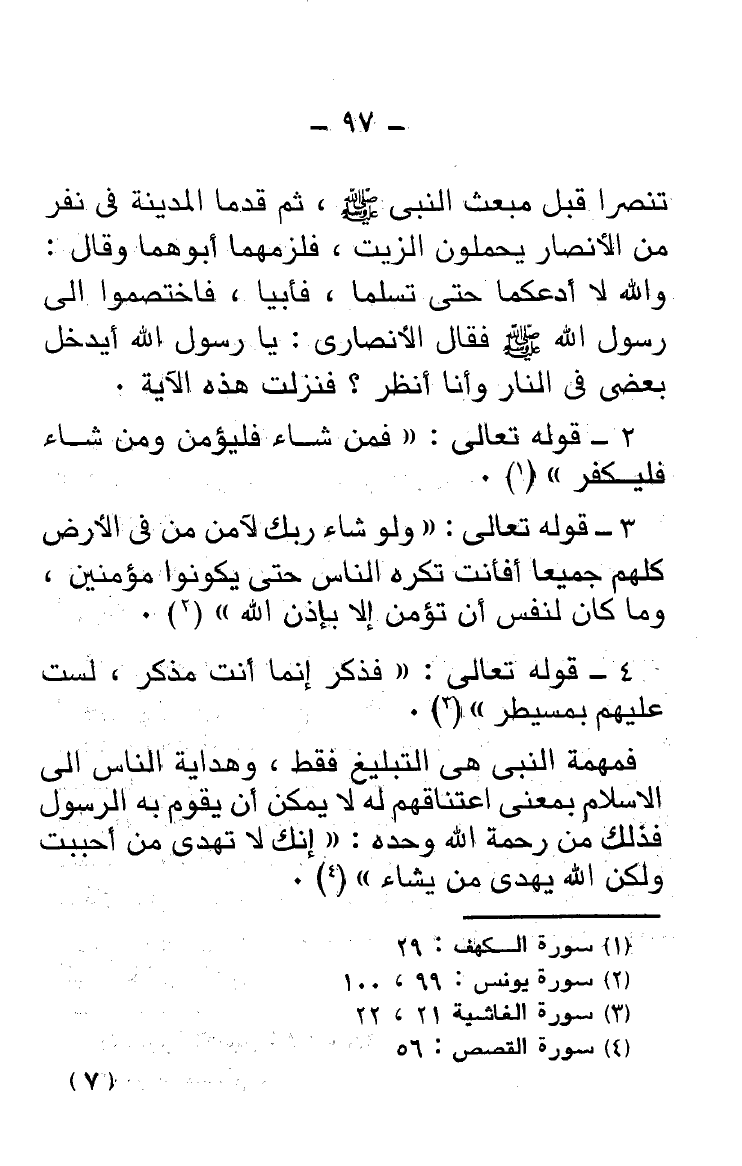 فمهمة النبي هى التبليغ فقط، وهداية الناس إلى الإسلام بمعنى اعتناقهم له لا يمكن أن يقوم به الرسول فذلك من رحمة الله وحده: {إِنَّكَ لَا تَهْدِي مَنْ أَحْبَبْتَ وَلَكِنَّ اللَّهَ يَهْدِي مَنْ يَشَاءُ} (¬4).