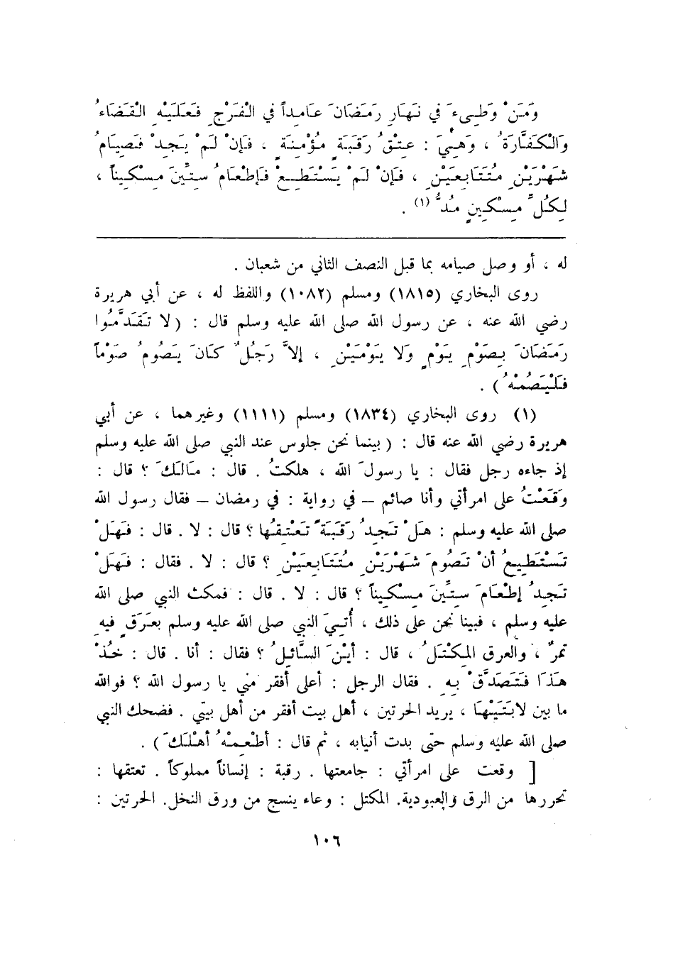 (¬1) روى البخاري (1834) ومسلم (1111) وغيرهما، عن أبي هريرة رضي الله عنه قال: (بينما نحن جلوس عند النبي صلى الله عليه وسلم إذ جاءه رجل فقال: يا رسولَ الله، هلكتُ. قال: مالك؟ قال: وَقَعتُ على امرأتي وأنا صائم - في رواية: في رمضان - فقال رسول الله صلى الله عليه وسلم: هَلْ تَجدُ رقبَةً تَعْتِقُها؟ قال: لا. قال: فَهَلْ تَسْتَطِيع أنْ تَصُومَ شَهرَينَِ مُتَتَابِعيْنِ؟ قال: لا. فقال: فهَلْ تَجدُ إطعَامَ سِتَينَ مِسكِيناً؟ قال: لا. قال: فمكث الله صلى الله عليهَ وسلم، فبينا نحن على ذلك، أُتِيَ النبي صلى الله عليه وسلم بعرًق فيه تمرٌ، والعرق المِكْتَلُ، قال: أيْنَ السائلُ؟ فقال: أنا. قال: خُذ هَذا فتَصَدقْ بِهِ. فقال الرجل: أعلى أَفقر مني يا رسول الله؟ فوالله ما بين لابَتَيْها، يريد الحرتين، أهل بيت أفقر من أهل بيتي. فضحك النبى صلى الله عليه وسلم حتى بدت أنيابه: ثم قال: أطعمْهُ أهْلكَ).